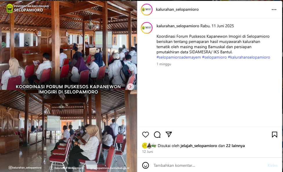 Koordinasi Forum Puskesos Kapanewon Imogiri di Selopamioro berisikan tentang pemaparan hasil musyawarah kalurahan tematik oleh masing masing Bamuskal dan persiapan pmutakhiran data SIDAMESRA/ IKS Bantul. #selopamioroademayem #selopamioro #kalurahanselopamioro